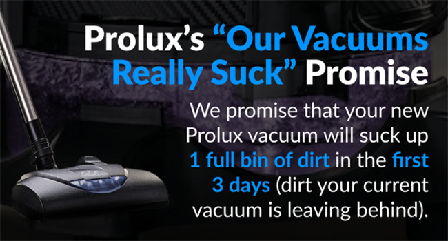 At Prolux our USA-designed vacuums have so much more deep cleaning power that WE PROMISE that you will fill up 1 full dirt bin (water bowl) of dirt your first 3 days of using it (dirt your old vacuum is leaving behind) OR we will send you a shipping label and 100% of your money!